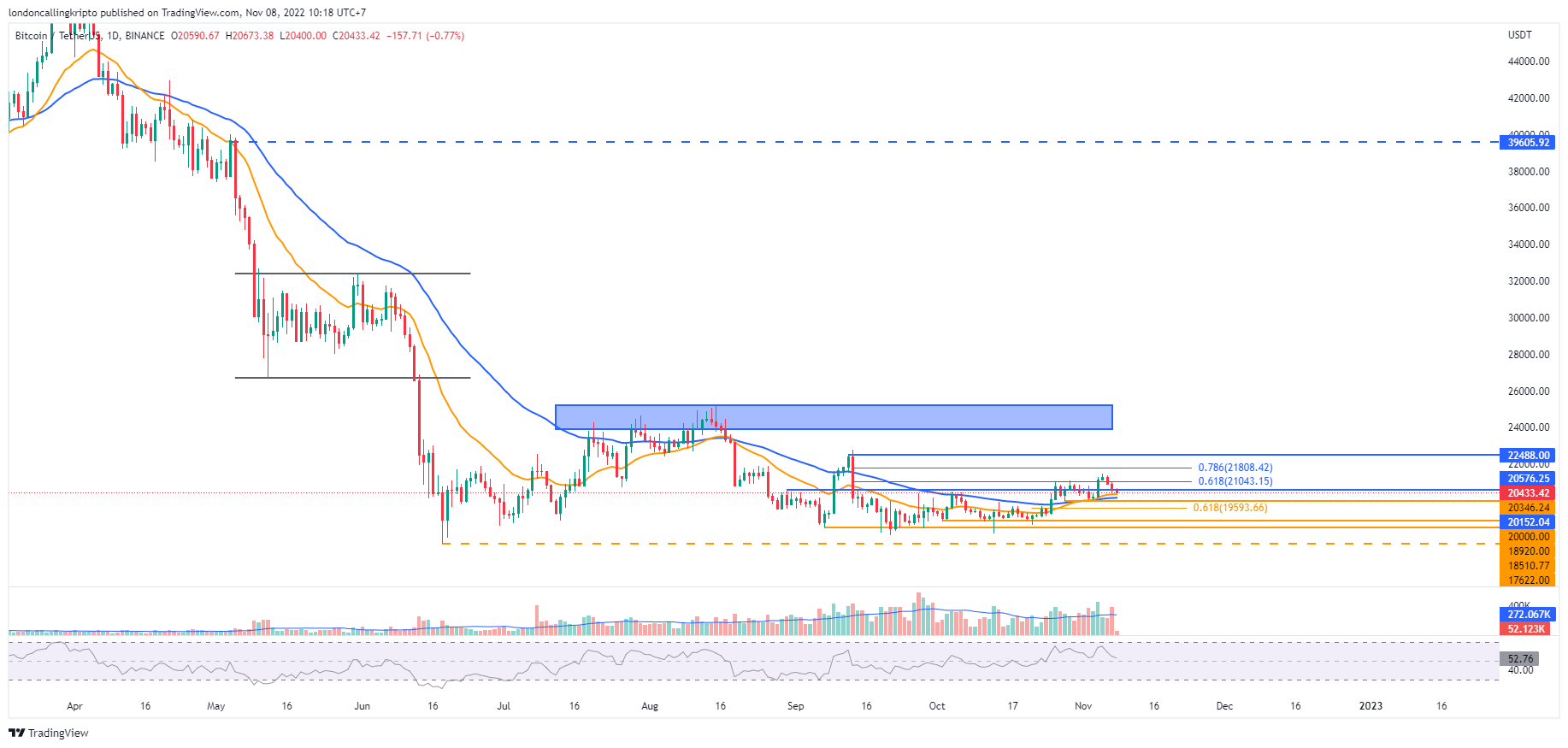 Harga terendah pada 28 Oktober di level $20.000 menjadi titik support selanjutnya apabila tekanan jual masih tinggi yang menyebabkan penurunan harga lebih lanjut.