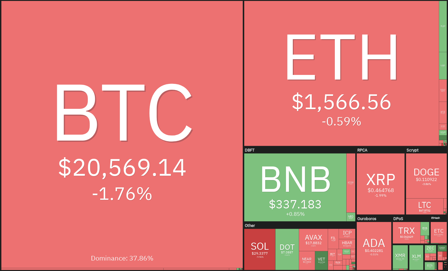 Penurunan harga Bitcoin berhasil breakdown support terdekatnya di level $20.576. Kemungkinan penurunan akan berlanjut jika 20-day EMA di level $20.342 sebagai dinamis support tidak mampu menahan laju turun Bitcoin.