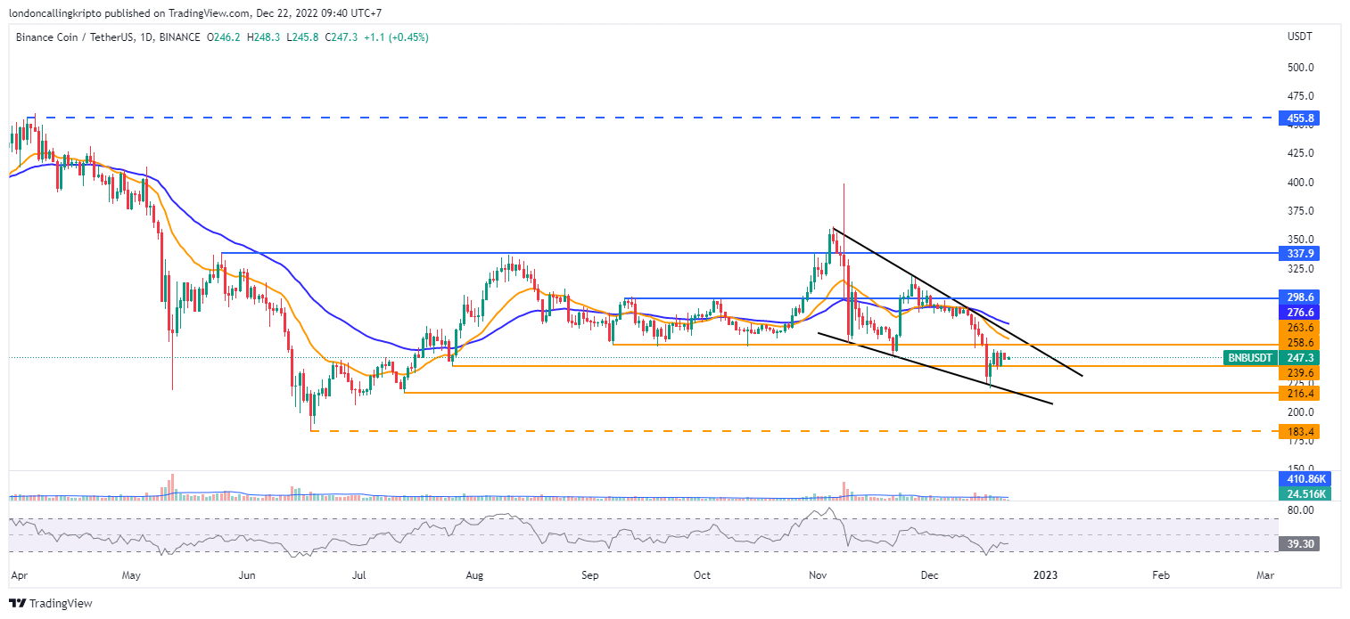 Pergerakan harga BNB cender sideways setelah penurunan harga pada 19 Desember tertahan support terdekat pada level $239,6.