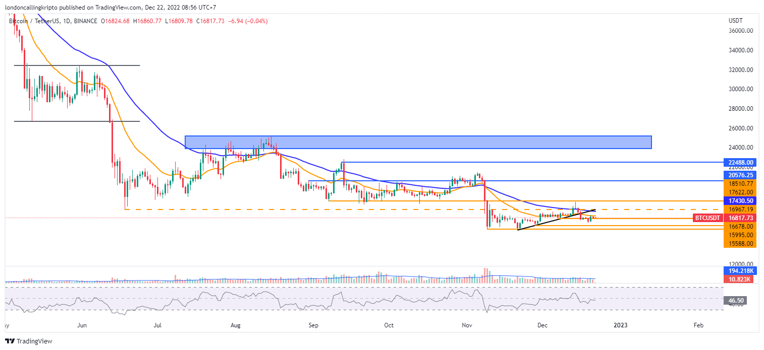 Harga terendah pada penutupan kandil harian 7 Desember di level $16.678 masih menjadi tahanan terdekat apabila harga Bitcoin kembali koreksi.