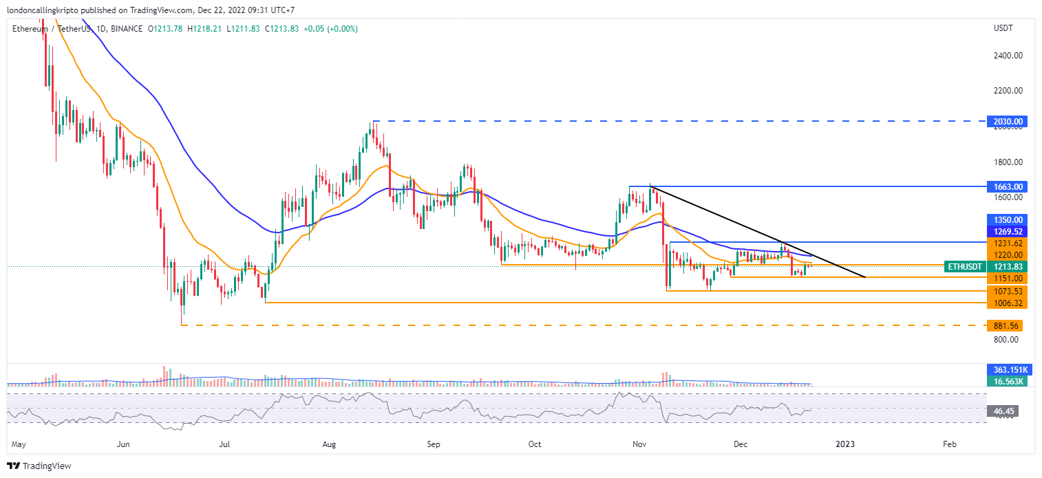 Breakout dinamis resistance pada 20-day EMA di level $1.231 kemungkinan akan menjadi pemicu yang baik untuk mendorong kembali kenaikan harga ETH.