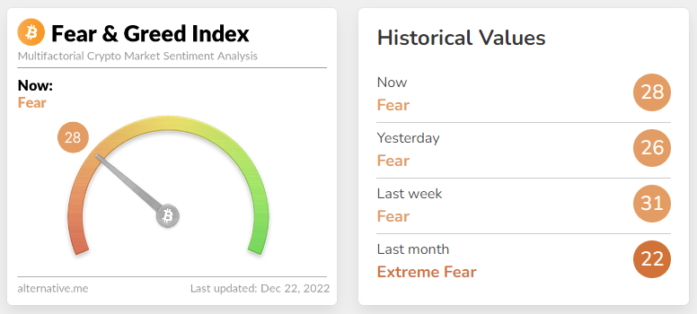 Sentimen pasar kripto kembali terangkat setelah Bitcoin dan altcoin dengan kapitalisasi teratas terlihat bertahan setelah mengalami kenaikan pada penutupan kandil harian 20 Desember. Fear and greed index ditutup pada level 28, naik dua poin dari penutupan kandil harian 20 Desember, dengan kategori fear.