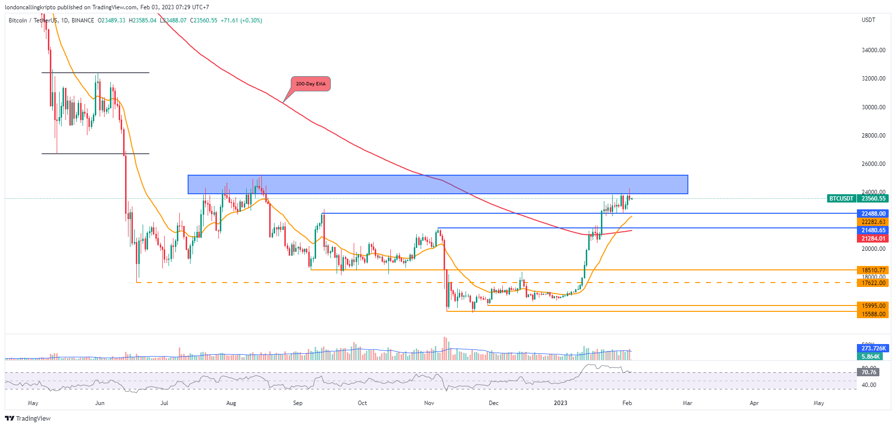 Daily candle Bitcoin pagi ini ditutup pada harga $23.488, level tertinggi berada pada harga $24.523, dan level terendah berada pada harga $23.363.