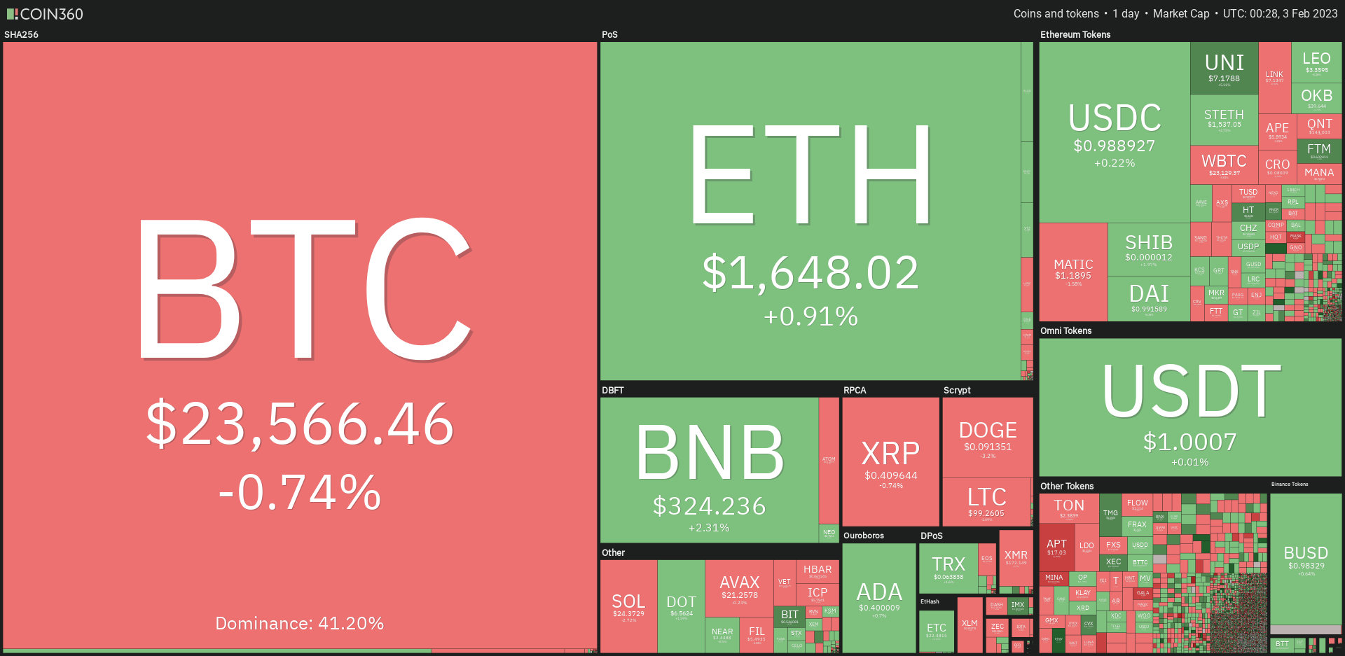 Bitcoin mengalami koreksi, turun 1,03%, setelah pumping pada penutupan kandil 1 Februari. ETH ditutup hijau dengan kenaikan harga yang tipis, sebesar 0,09%, dan BNB berhasil mempertahankan tren positif, dengan mencatatkan kenaikan sebesar 2,05%.