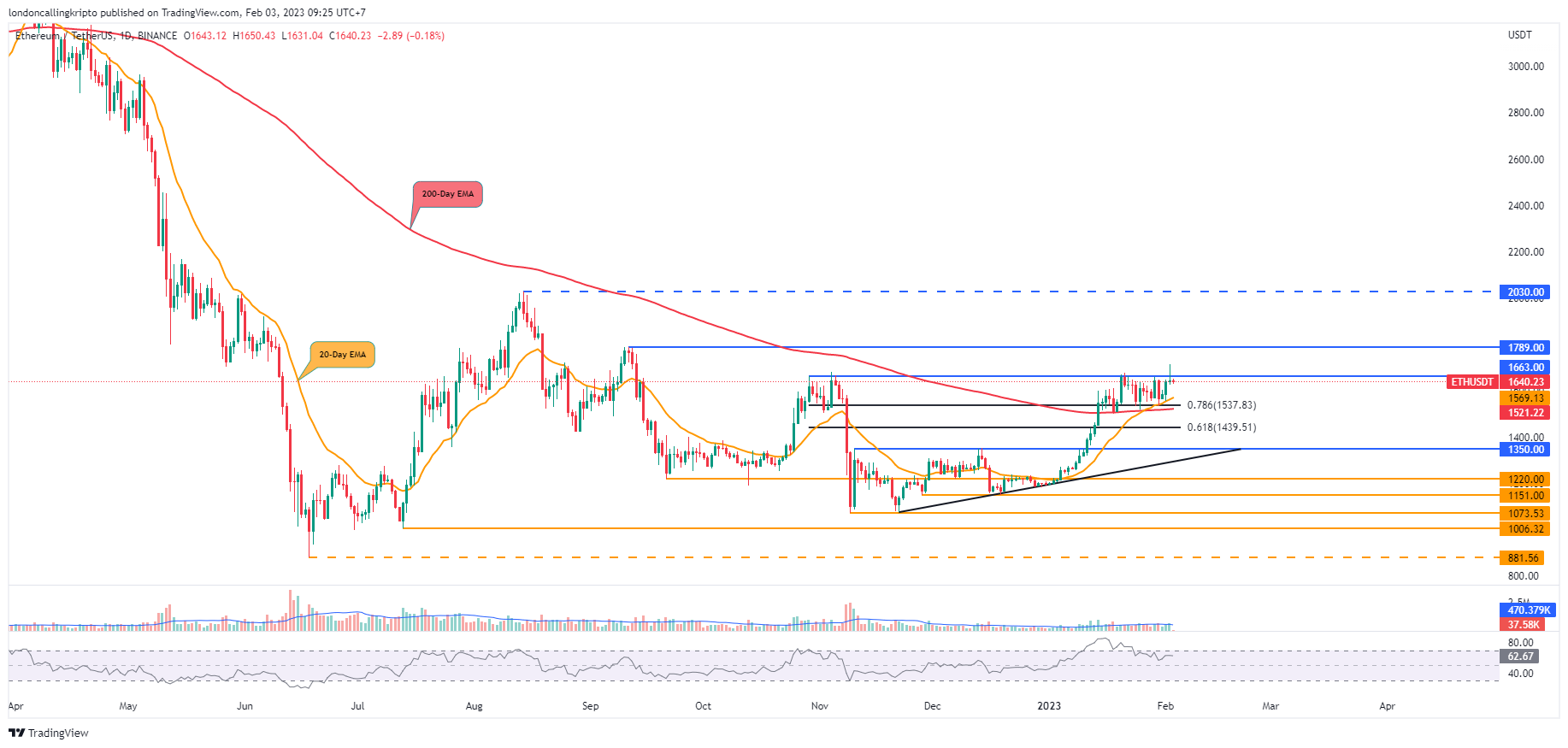 Apabila pergerakan harga ETH berhasil breakout titik tersebut, kemungkinan laju bullish akan berlanjut dengan target berada pada resistance di level $1.789.