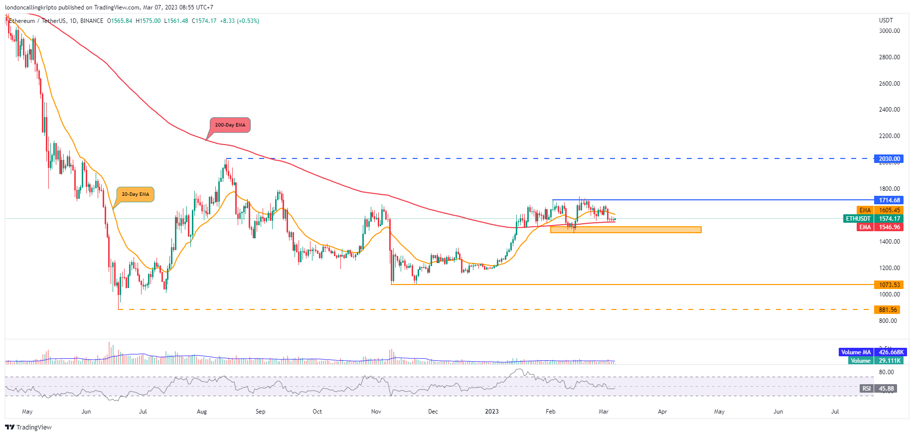 Pergerakan harga ETH kembali menyentuh 200-day EMA di level $1.546 sebagai dinamis support. Titik tersebut merupakan tahanan penting untuk mencegah penurunan harga lebih dalam.