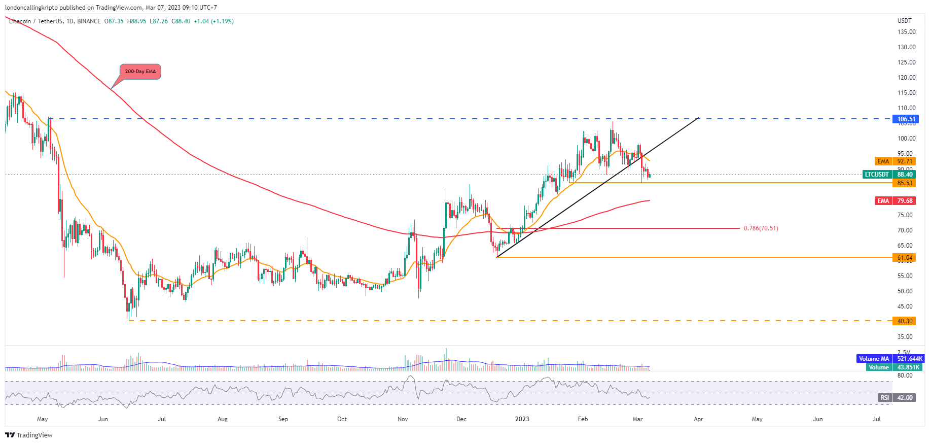 Pergerakan harga LTC masih berad diatas 200-day EMA, meskipun mengalami penurunan dan berhasil breakdown uptrend line pada 3 Maret.
