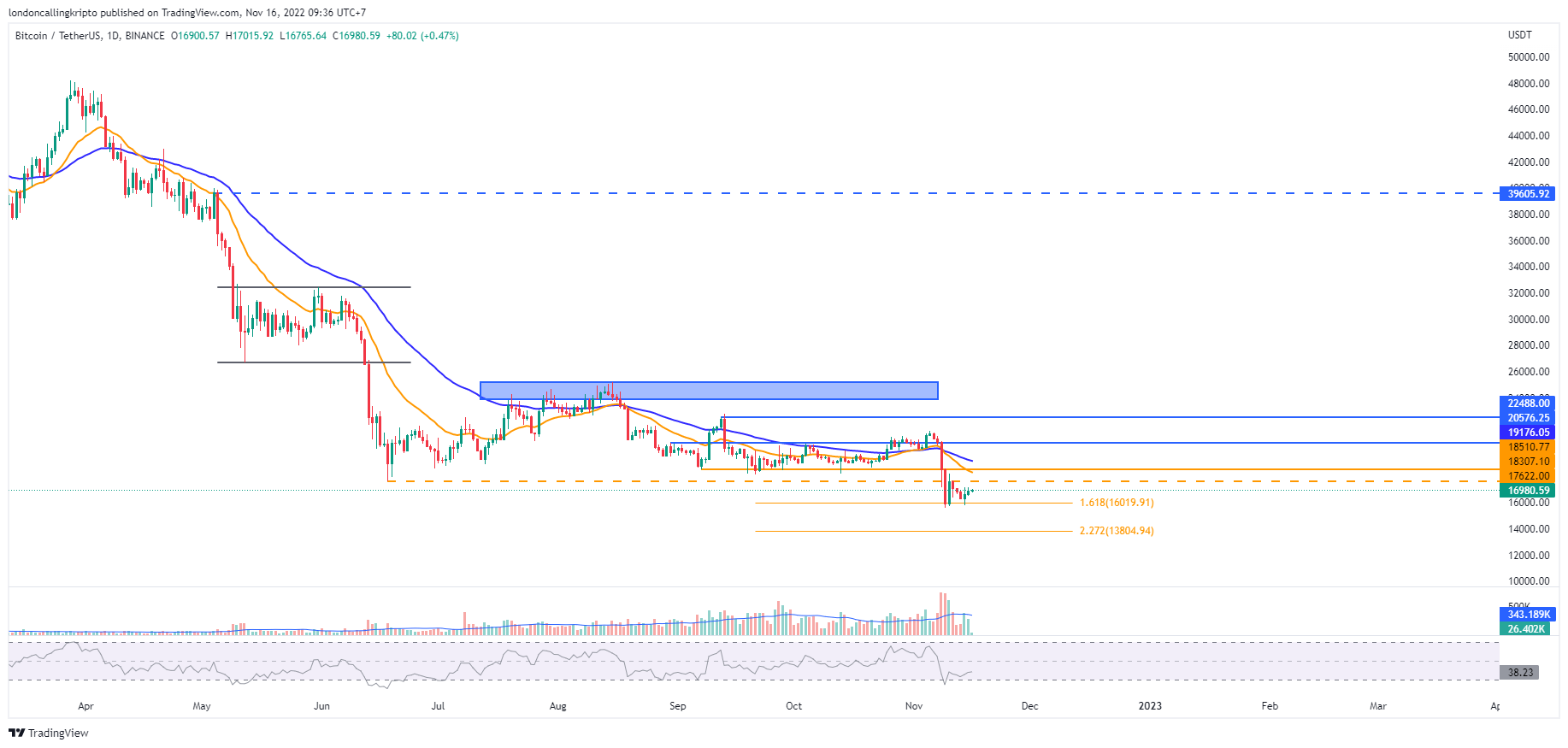 Pergerakan harga Bitcoin meneruskan laju pullback-nya setelah laju bearish tertahan support di level $16.019.