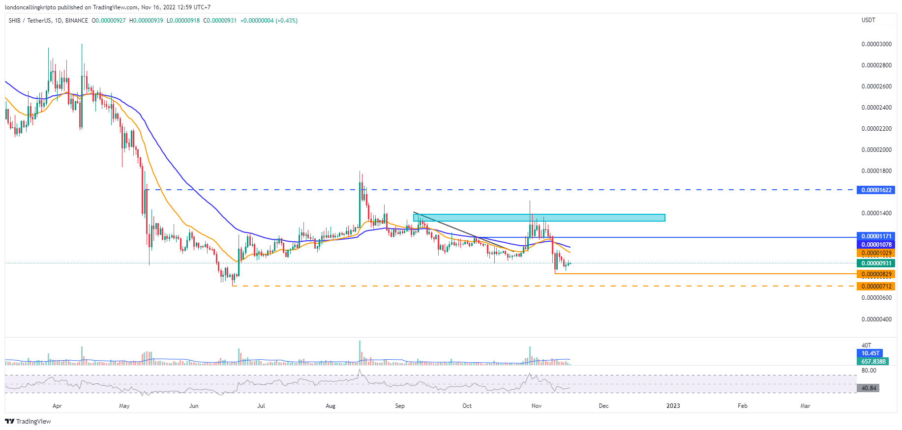 SHIB mengalami penurunan yang cukup dalam, sebesar 35,58% pada periode 6-9 November. Penurunan harga tersebut menciptakan titik support baru pada level $0,00000829, yang merupakan harga terendah pada penutupan kandil harian 9 November.
