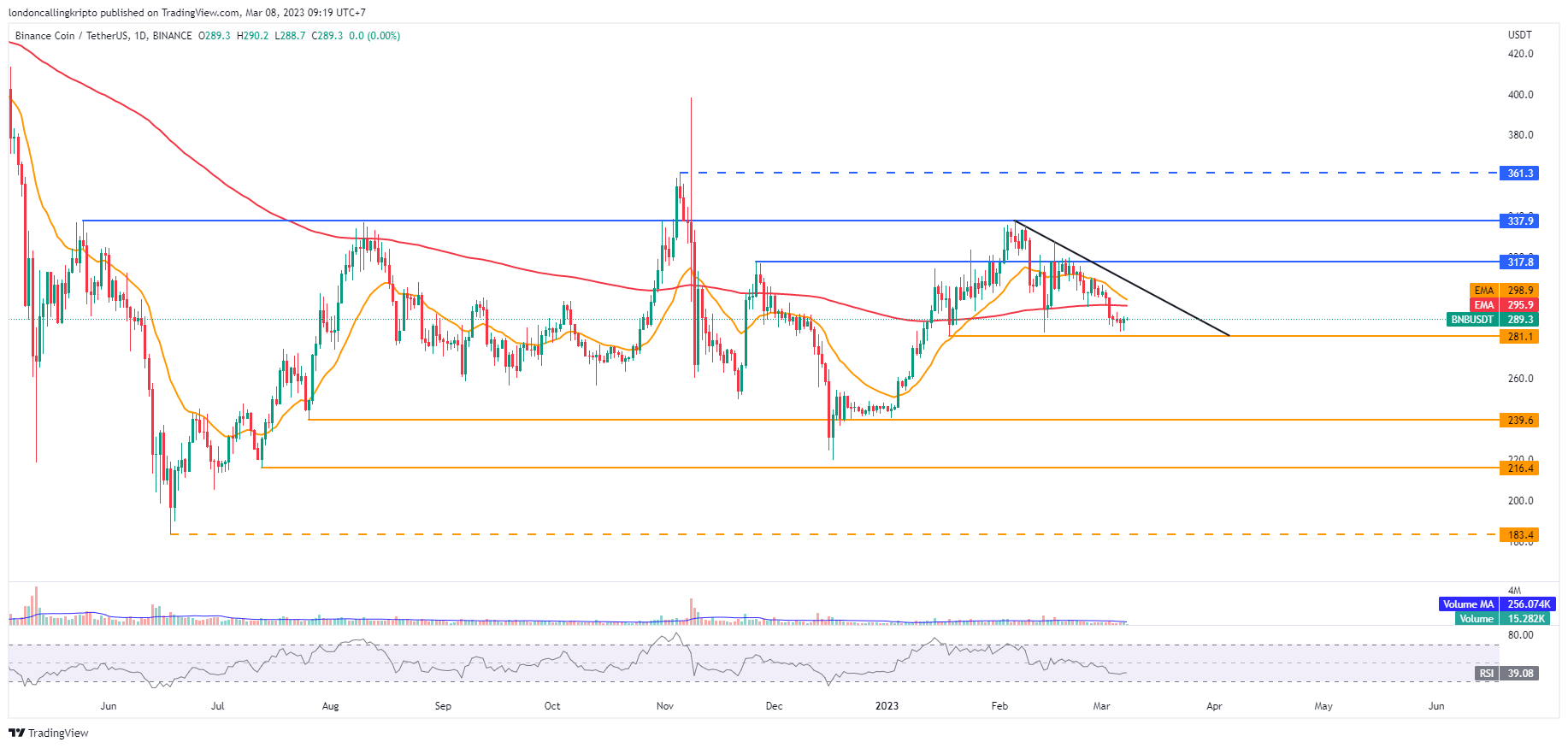Support terdekat BNB berada pada harga terendah penutupan kandil harian 18 Januari di level $281,1.