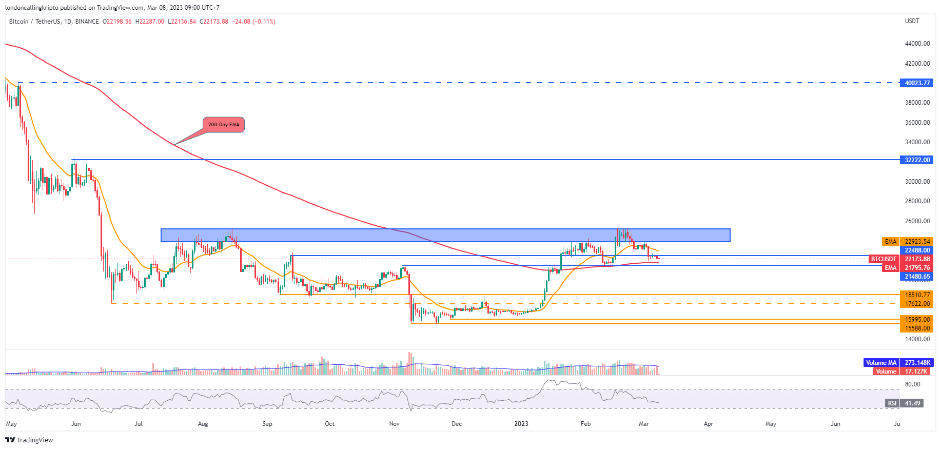 Harga Bitcoin kembali turun ketika menyentuh titik tersebut. Penurunan harga Bitcoin mendekati dinamis support pada 200-day exponential moving average (EMA) di level $21.795.