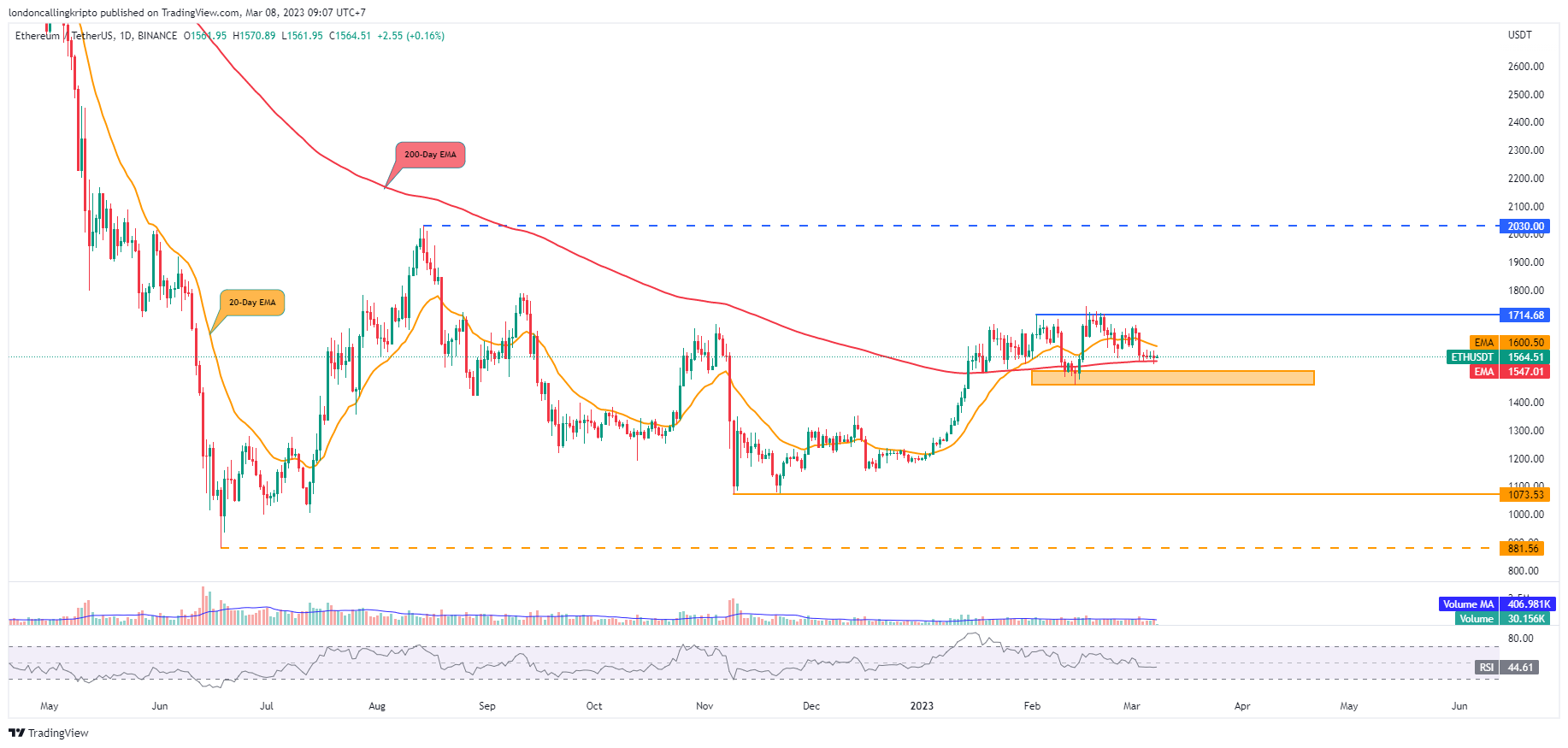 Resistance terdekat ETH berada pada 20-day EMA di level $1.600, dan support selanjutnya berada pada area $1.464-$1.512.