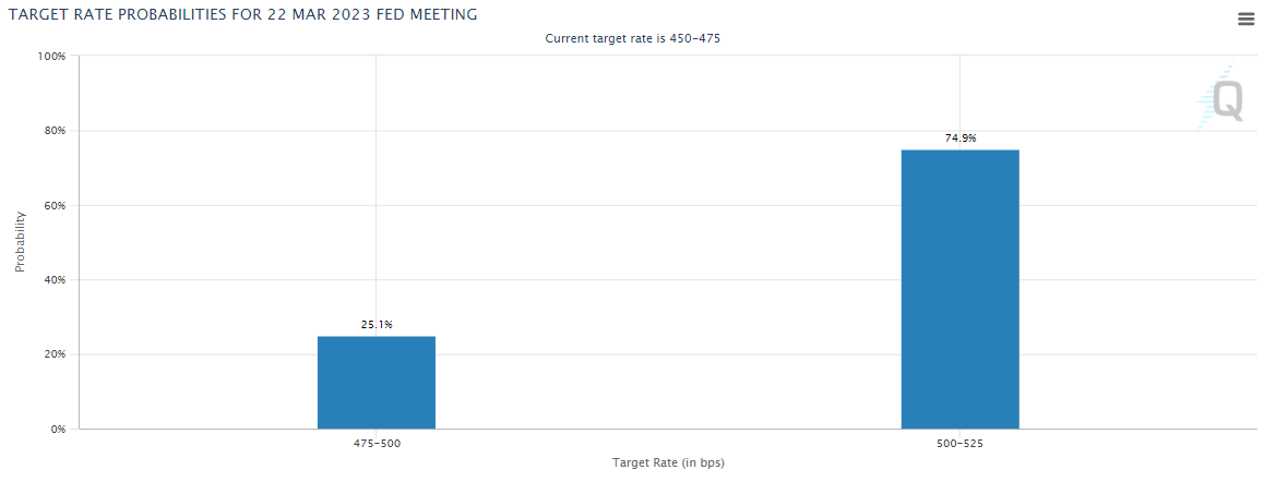 Berdasarkan data FedWatch Tool dari cmegroup.com pada 8 Maret, probabilitas suku yang akan diumumkan pada 23 Maret untuk kenaikan 25 basis poin sebanyak 23,6%, dan 50 basis sebanyak 76,4%.