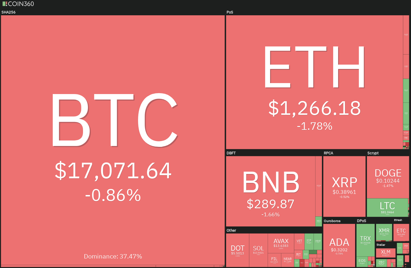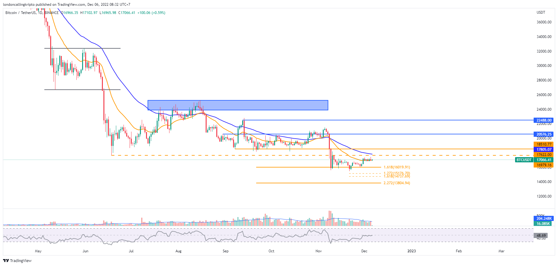 Pergerakan harga Bitcoin bergerak sideways pada 20-Day exponential moving average (EMA) di level $16.978 sebagai dinamis support.