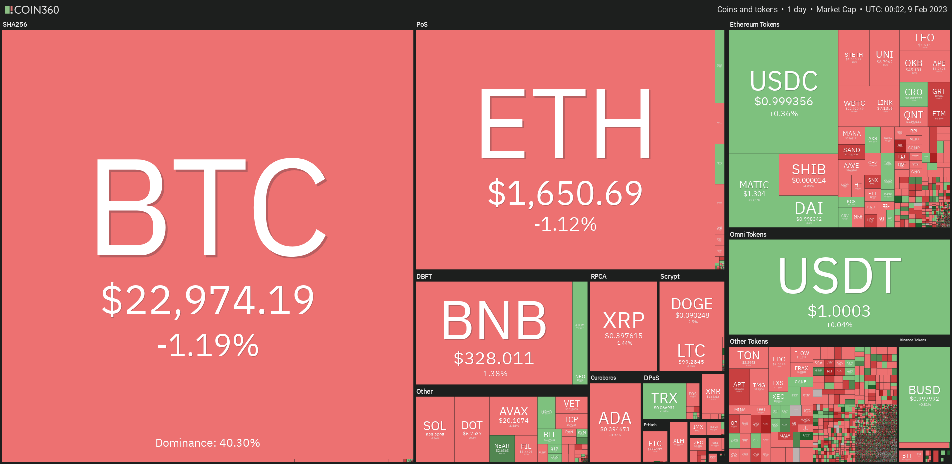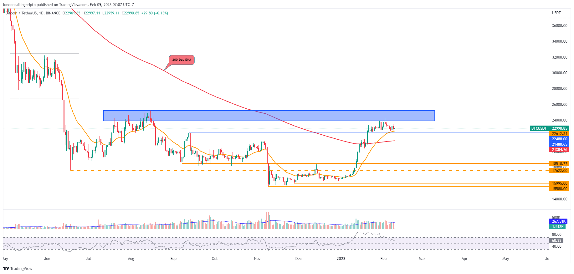 Pergerakan harga Bitcoin masih berada pada area sideways, dengan support berada pada level $22.488 dan resistance berada pada level $23.888.