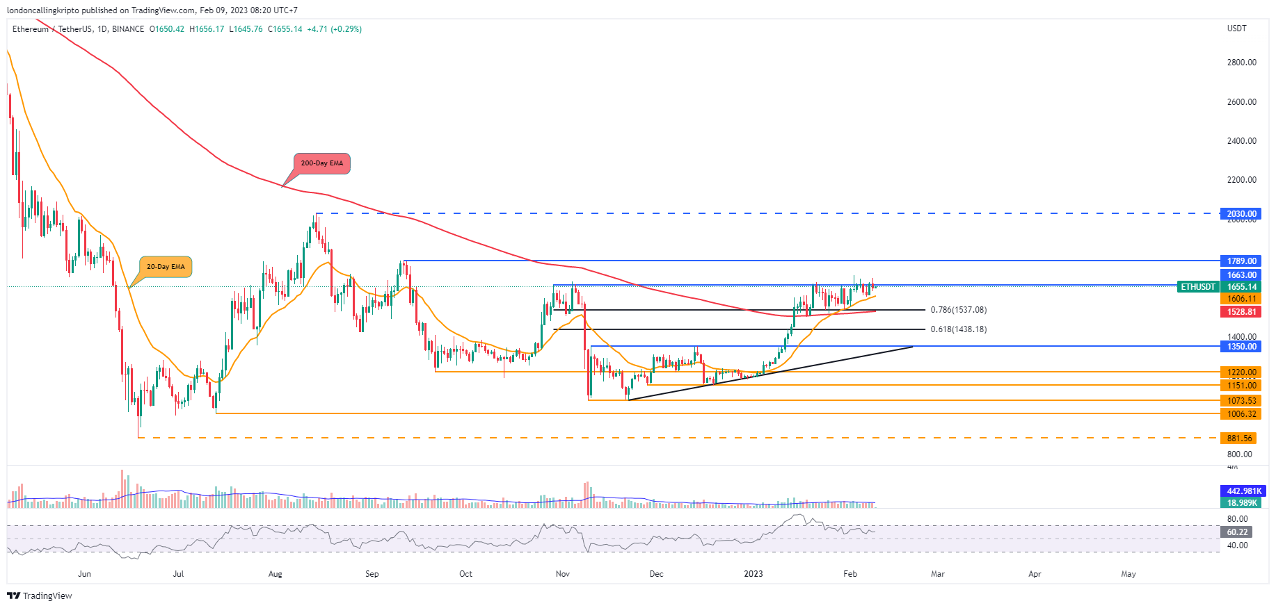 Pergerakan harga ETH mengalami penolakan ketika berusaha untuk breakout resistance terdekatnya pada level $1.663, yang berimbas pada penurunan harga.