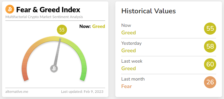 Penurunan harga yang terjadi pada major aset kripto pagi ini berdampak pada penurunan sentimen pasar. Fear and greed index turun tiga poin, ditutup pada level 55, dengan kategori Greed.