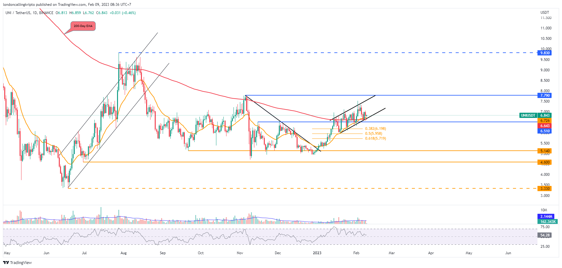 Daily candle UNI pagi ini ditutup pada harga $6,812, level tertinggi berada pada harga $7,061, dan level terendah berada pada harga $6,578.