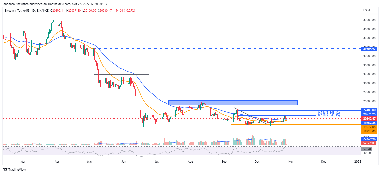 Kandil harian Bitcoin ditutup merah dengan penurunan sebesar 2,29%. Daily candle pagi ini ditutup pada harga $20.295, level tertinggi berada pada harga $20.872 dan level terendah berada pada harga $20.200.