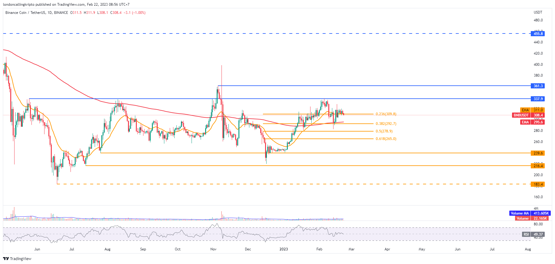 BNB kembali retest 20-day EMA sebagai dinamis support. Kandil harian BNB ditutup merah dengan penurunan sebesar 1,24%.