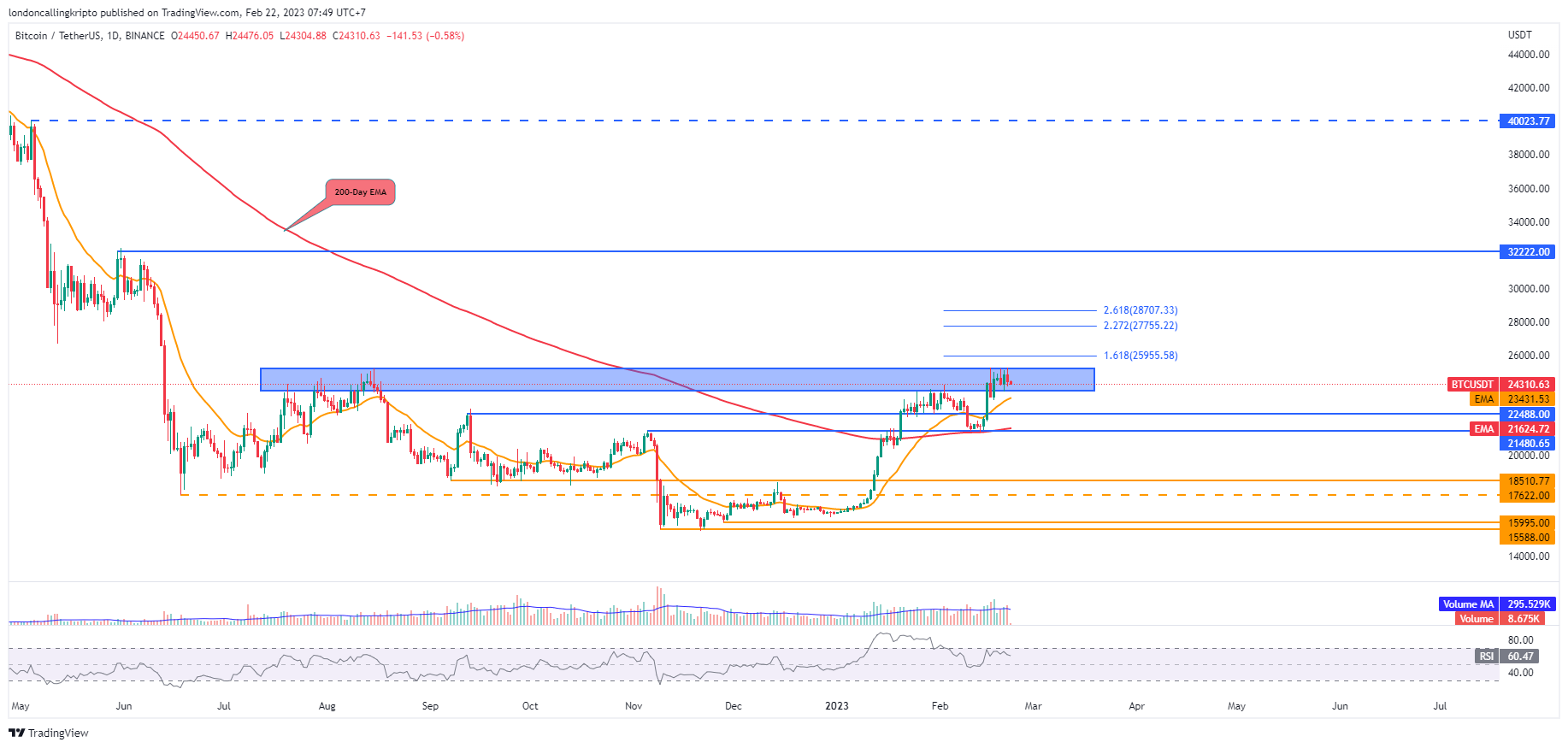 Pergerakan harga Bitcoin masih bergerak sideways di area supply pada level $23.888-$25.198 setelah berhasil breakout pada 15 Februari.