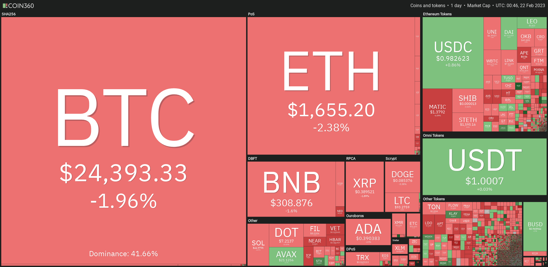 Daily candle Bitcoin pagi ini ditutup pada harga $24.452, level tertinggi berada pada harga $25.250, dan level terendah berada pada harga $24.148.