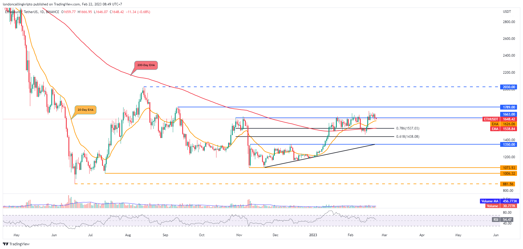 Pergerakan harga ETH tidak mampu menciptakan higher high setelah gagal melewati resistance pada 16 februari di level $1.742.