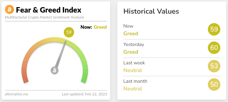 Penurunan harga pagi ini tidak begitu berpengaruh terhadap sentimen pasar kripto. Fear and greed index turun satu poin, ditutup pada level 59, dengan kategori Greed.