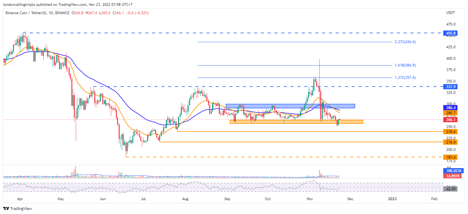 Apabila pergerakan harga BNB dapat bertahan untuk bergera diatas area support tersebut, maka dinamis resistance pada level $280,6 menjadi target naik selanjutnya.