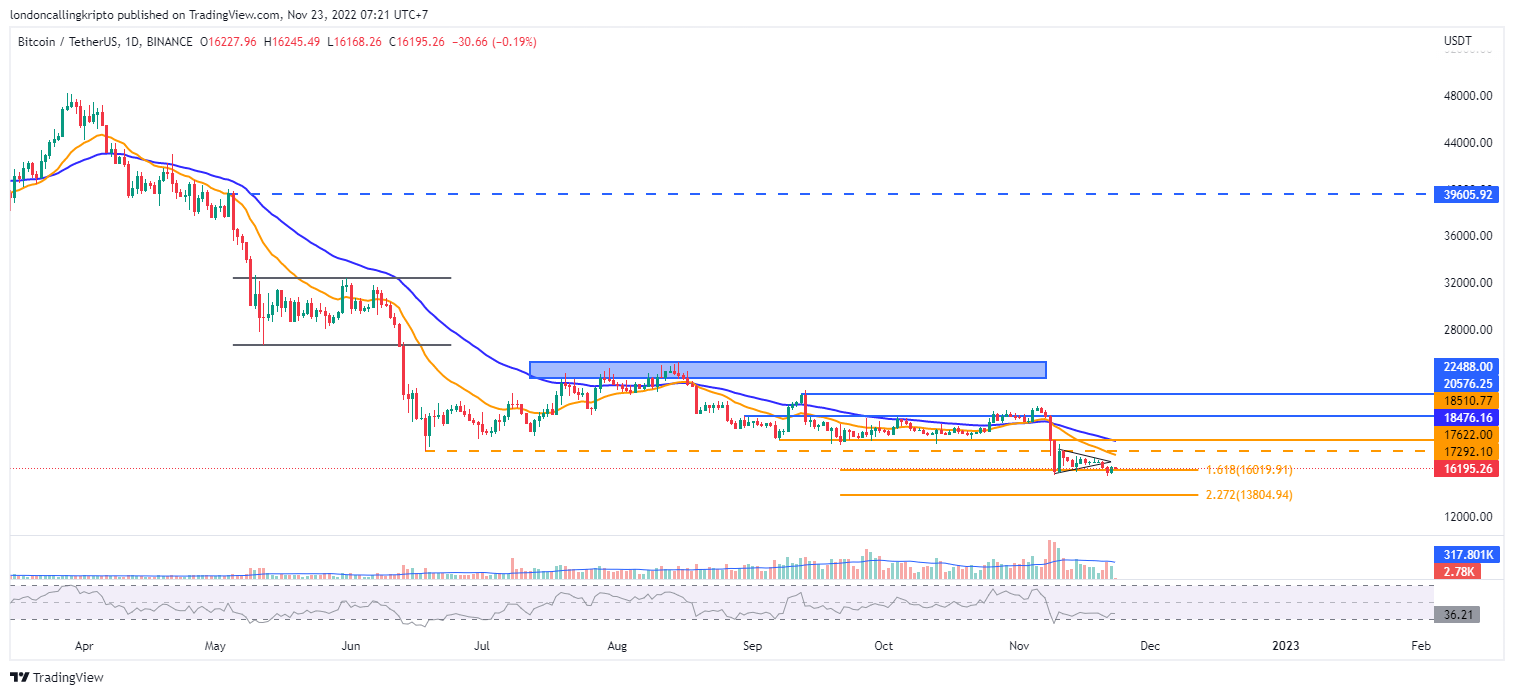 Harga Bitcoin kemungkinan akan lanjut bergerak naik jika penutupan kandil harian 23 November berhasil ditutup hijau. Dinamis resistance pada 20-day exponential moving average (EMA) di level $17.292 menjadi target pullback terdekat Bitcoin.