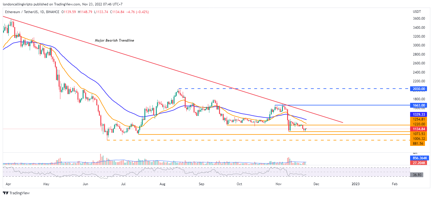 Daily candle ETH pagi ini ditutup pada harga $1.139, level tertinggi berada pada harga $1.146 dan level terendah berada pada harga $1.075.