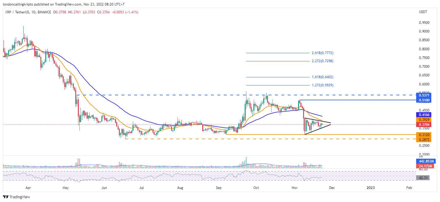 Titik resistance yang terbentuk pada 5 November di level $0,5100 menjadi target utama laju pullback XRP dan harga terendah sementara tahun 2022 di level 0,2872 merupakan major support XRP saat ini.