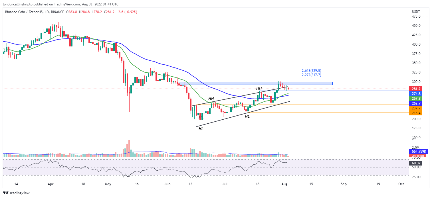 Penurunan harga BNB tertahan pada saat menyentuh level $274 yang merupakan resistance yang berubah menjadi support. Day-20 dan day-50 EMA pada level $269-$263 masih menjadi tahanan apabila harga BNB melanjutkan penurunan. Resistance area pada harga $290-$298 menjadi target apabila harga BNB mampu membalikan arah.