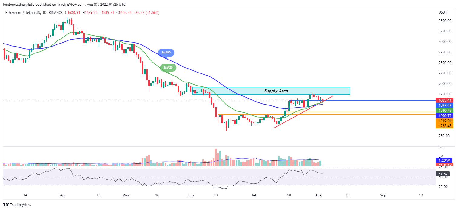 Resistance sebelumnya pada level $1.597 masih menjadi support terdekat untuk ETH dan sekaligus tahanan dari ascending line nya. Jika terjadi breakdown, maka support berikutnya berada pada area harga $1.540-$1.498. Apabila terjadi bounce, target kenaikan ETH masih berada di supply area pada level $1.739-$1.916.