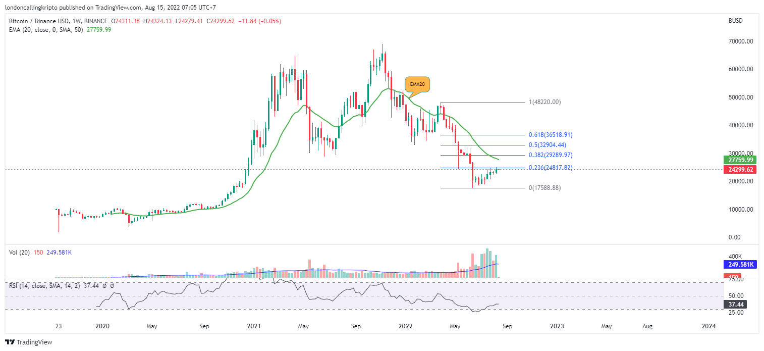 Harga Bitcoin saat ini sedang berusaha bergerak untuk mencapai day-20 exponential moving average (EMA), tetapi tertahan resistance fibonacci retracement ratio 0.236 pada level $24.817.