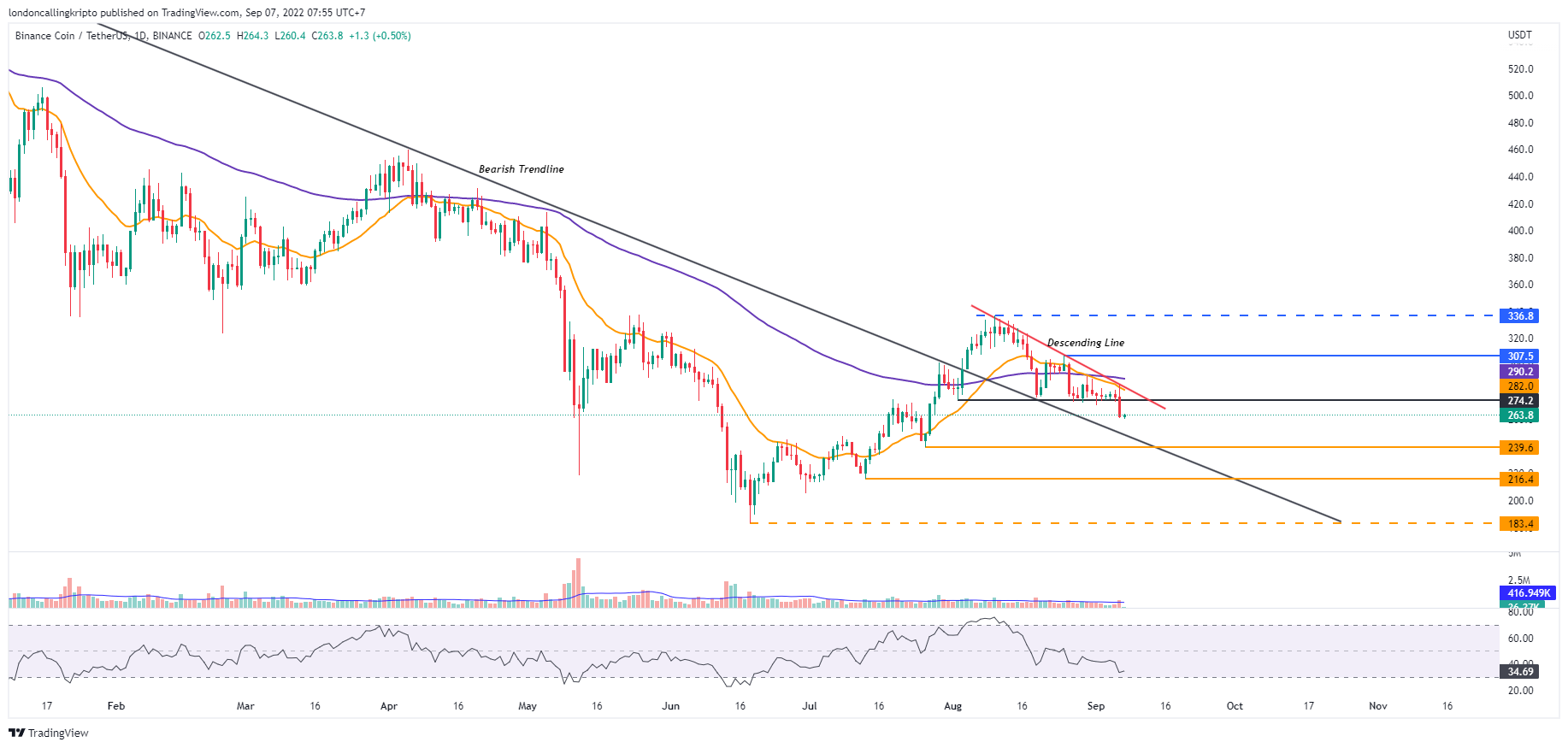 BNB breakdown dari support pada level $274 yang merupakan tahanan penting untuk pergerakan harga. Saat ini harga BNB bergerak turun mendekati bearish trendline. Kandil harian BNB ditutup merah dengan penurunan sebesar 5,20%.