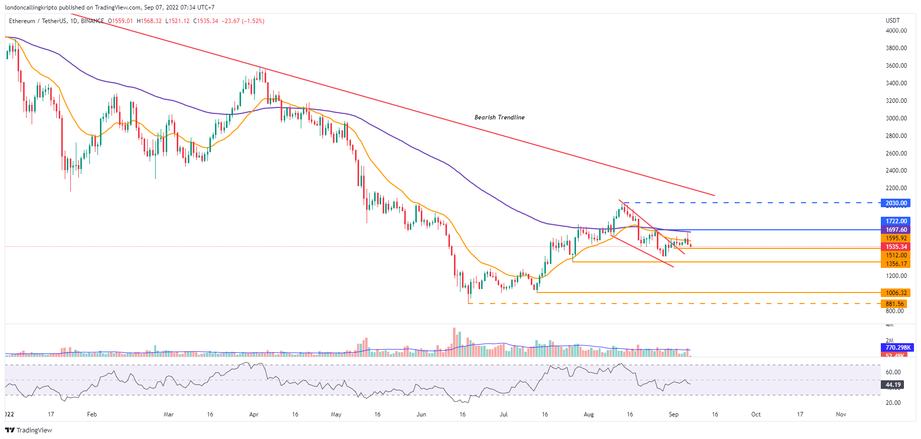 ETH masih terlihat kuat untuk menghadapi efek dari penurunan Bitcoin. Penurunan ETH mendekati support pada harga $1.512.