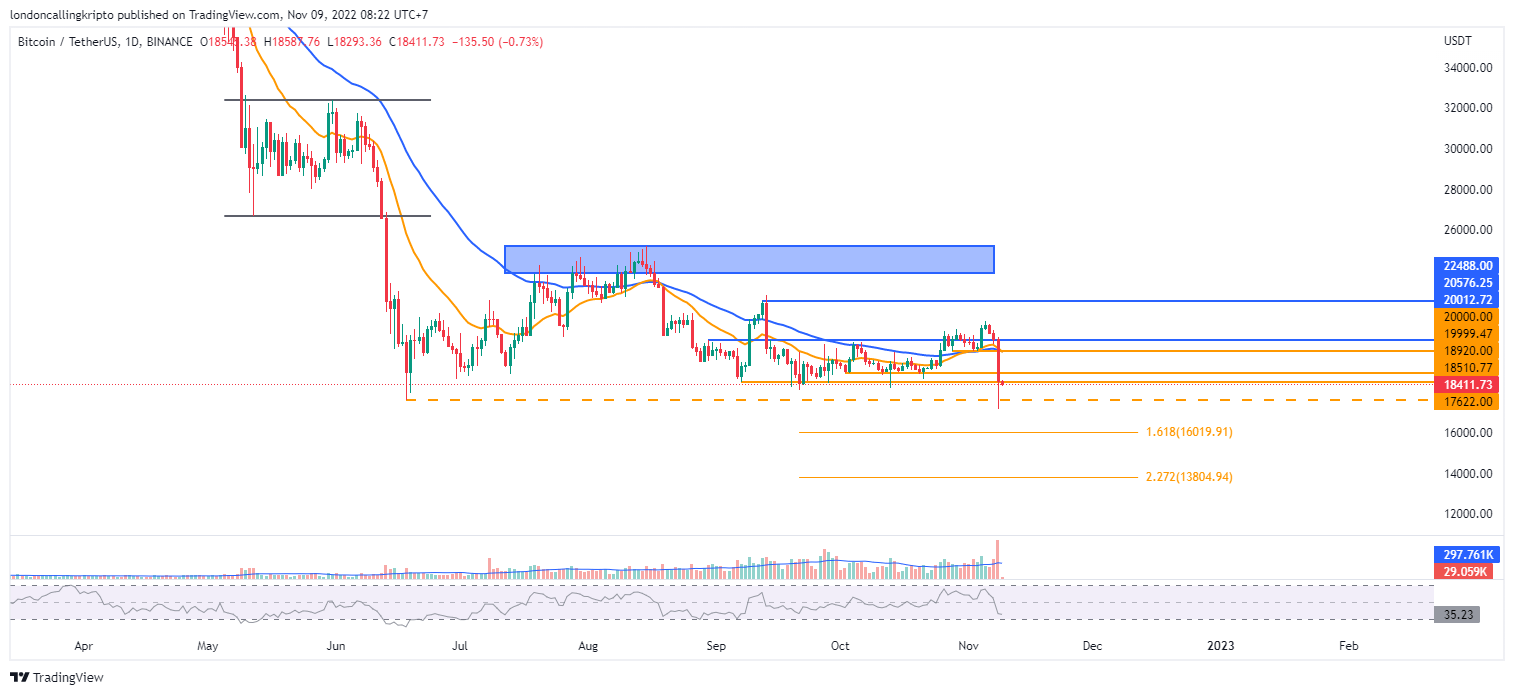 Harga terendah pada penutupan kandil harian 8 November di level $17.166 secara resmi menjadi major support baru tahun 2022.