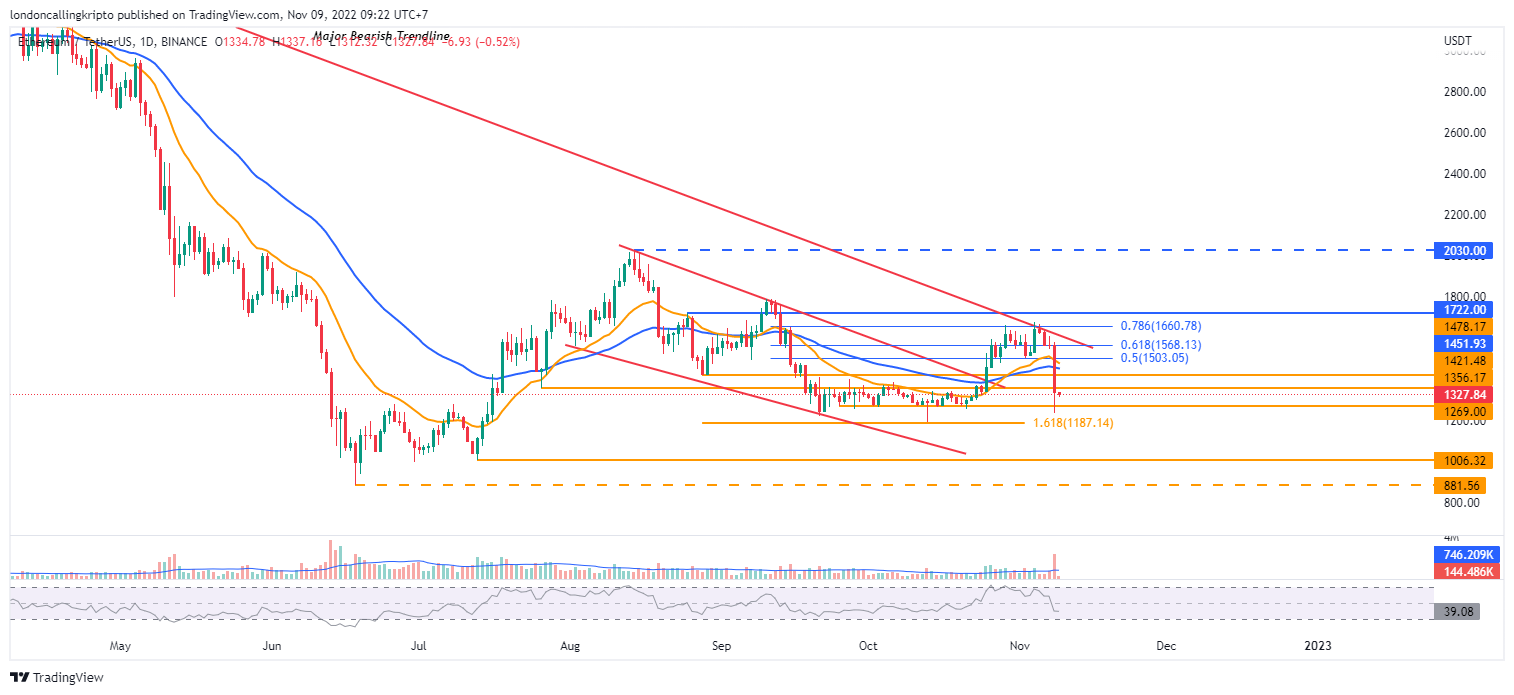 ETH turun tajam, setelah kandil harian pagi ini ditutup merah, dengan penurunan sebesar 14,88%. Penurunan harga mulai dirasakan ketika laju bullish tertahan major bearish trendline.