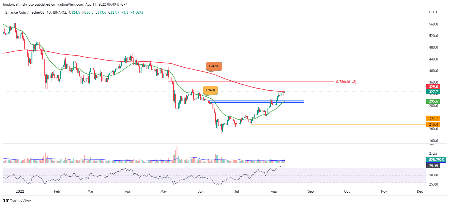 Day-200 EMA menjadi kunci untuk kenaikan harga BNB selanjutnya, apabila pergerakan harga BNB berhasil breakout, maka target kenaikan selanjutnya akan berada pada level $361.