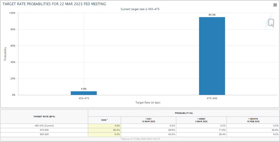 Data CME FedWatch Tool per 13 Maret 2023 menunjukkan angka probabilitas kenaikan suku bunga kuat di kisaran 25 bps. Tingkat probabilitas The Fed menaikkan suku bunga di kisaran 25 bps mencapai 95,2%. Sementara probabilitas kenaikan 50 bps mencapai titik nol, lebih rendah dibanding probabilitas suku bunga berlaku tetap sebesar 4,8%.