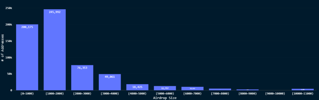 Peluncuran ARB ini berbarengan dengan momen pembagian airdrop kepada ratusan ribu peserta. Berdasarkan data Nansen, Arbitrum Foundation membagikan total 1,16 miliar token ARB, di mana 74% atau 862 juta di antaranya sudah diklaim hingga pukul 13.00 WIB siang. Terdapat total 625.143 alamat penerima airdrop di mana rata-rata partisipan menerima 1.859 ARB.