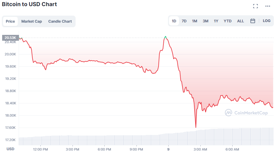 Bitcoin, kripto terbesar berdasarkan kapitalisasi pasar, ikut terdampak. BTC turun 11,17% dalam 24 jam terakhir dan kini berada di level $18.300. BTC bahkan sempat anjlok hingga titik rendah di $17.600.
