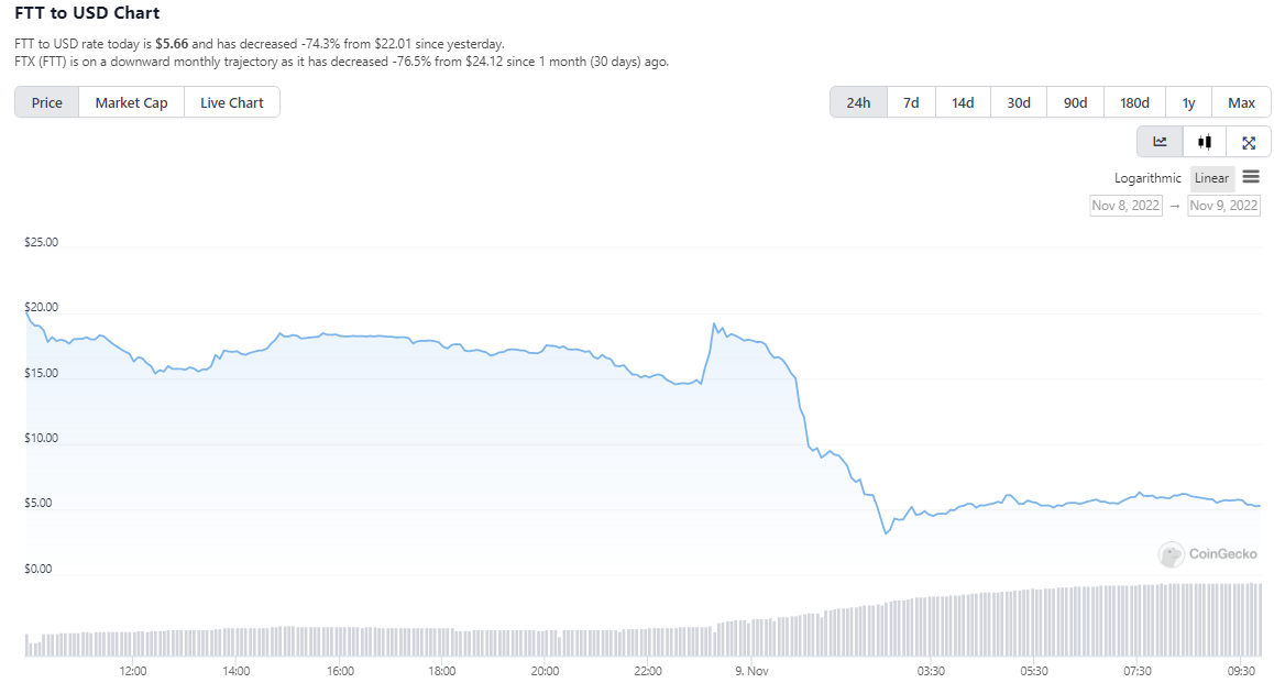 Namun krisis itu tampaknya nyata. Menurut data CoinGecko, harga token FTX, FTT, terus anjlok hingga 74% dalam 24 jam terakhir. FTT yang kemarin diperdagangkan di harga $22, kini anjlok di $5,68.