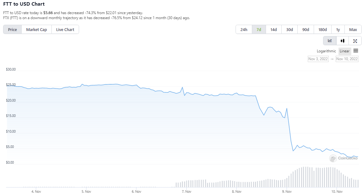 Nilai token asli FTX, FTT, terus merosot hingga 57,6% dalam 24 jam terakhir, menurut CoinGecko. Kini FTT diperdagangkan di harga $2,75, atau turun 80% dalam dua hari. Nilai total tokennya menyusut sebesar $308 juta.