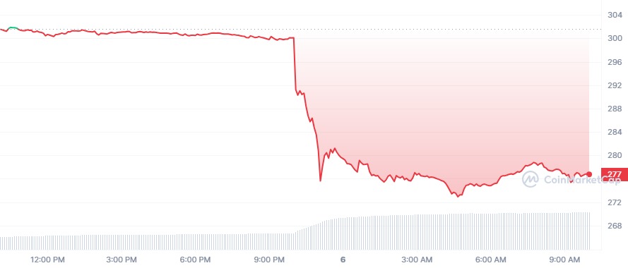 Sesaat setelah kabar gugatan SEC terhadap Binance muncul, harga BNB langsung anjlok hingga 8,3% dalam 24 jam terakhir. Menurut CoinMarketCap, saat ini BNB diperdagangkan di harga $276,4.