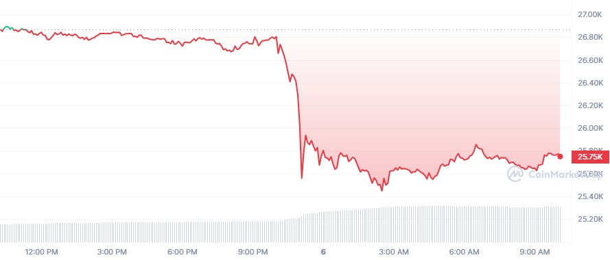 Mayoritas pasar juga bergerak merah setelah Bitcoin ikut ambles hingga 4,2% hari ini. BTC kembali ke level $25.700 untuk pertama kalinya sejak 17 Maret 2023.