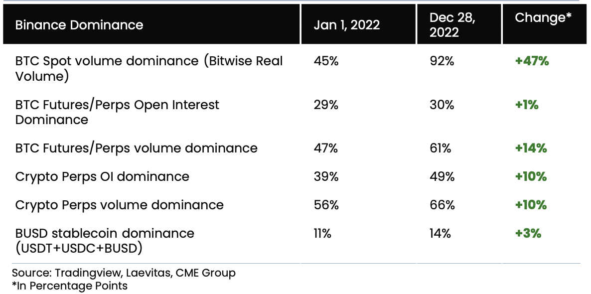 Menurut laporan Arcane Research yang dirilis 3 Januari 2023, market share Binance pada awal 2022 hanya 45%. Penghapusan trading fee pada 7 Juni dan kebangkrutan FTX pada 11 November diduga membuat pengguna Binance terus bertambah dan menguatkan dominasi exchange milik Changpeng Zhao (CZ) itu.