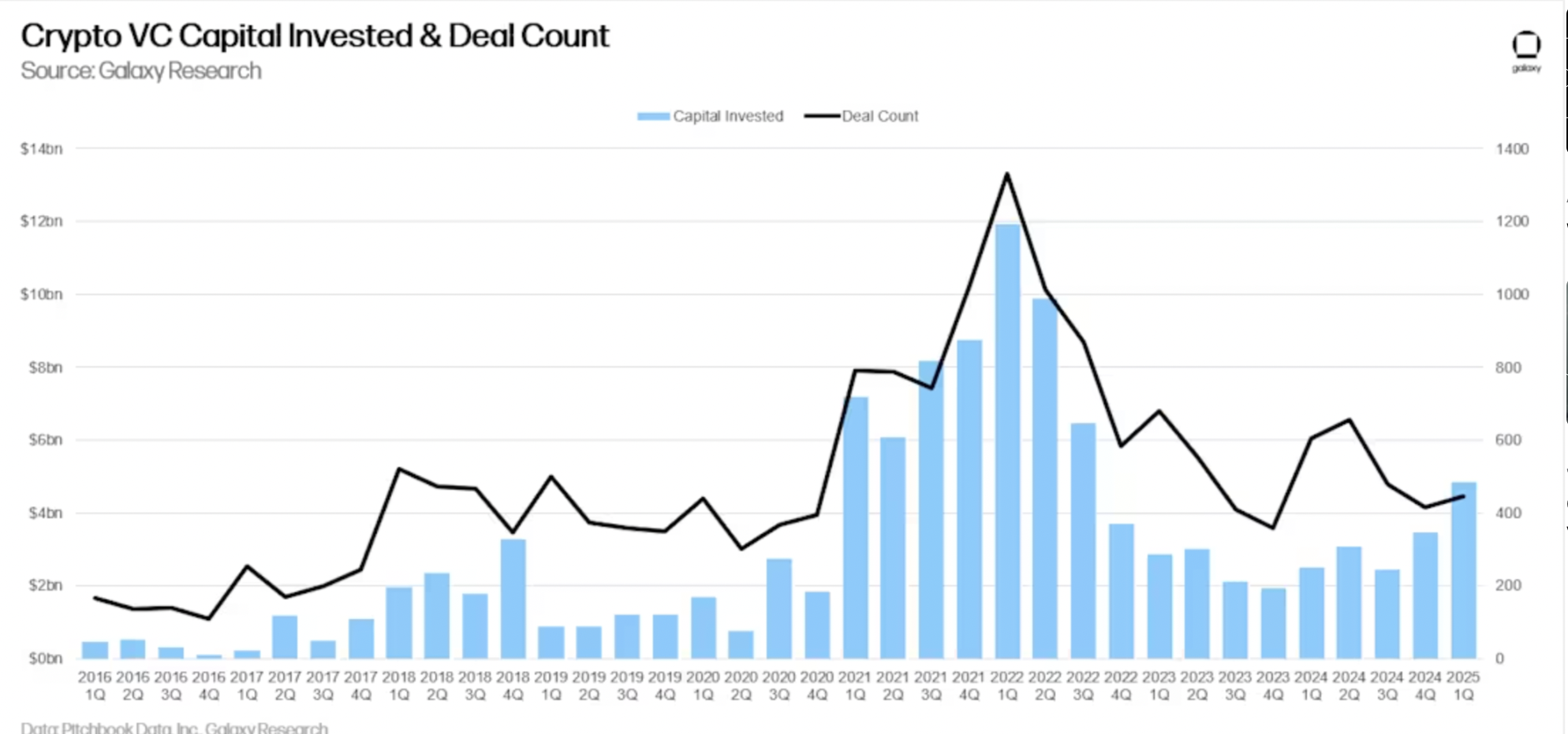 Based new report from Galaxy, crypto startups raised $4.9 billion across 446 deals in Q1 — up 40% from the previous quarter — marking the highest capital influx since Q3 2022.