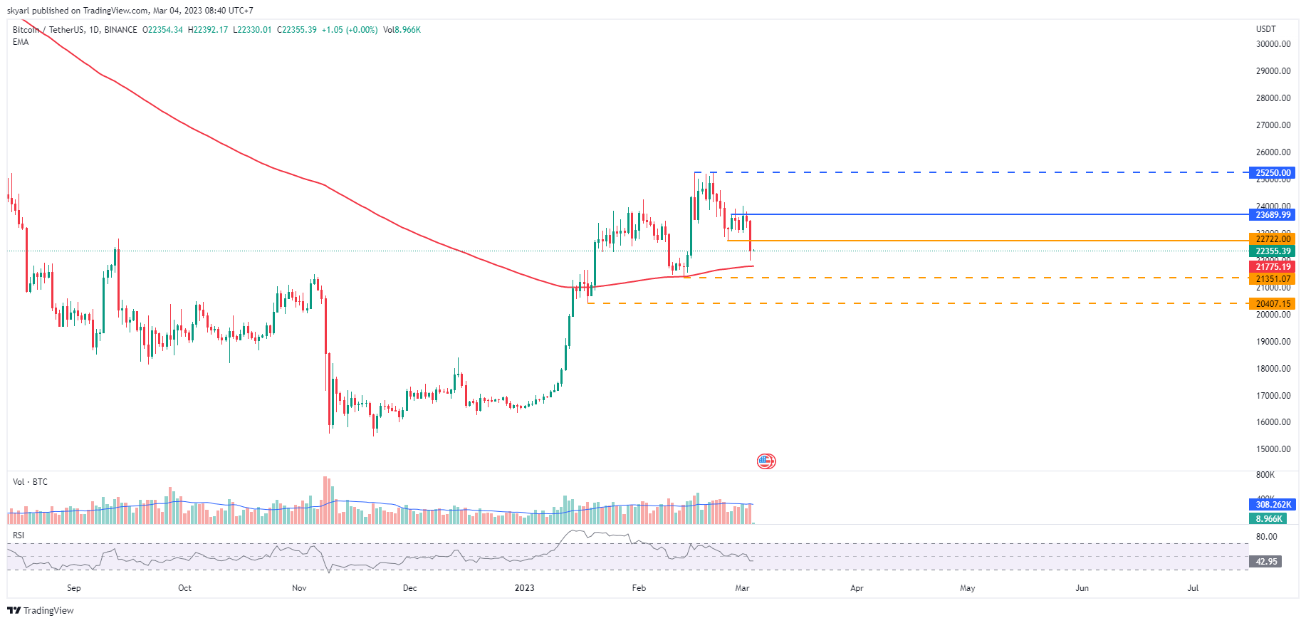 Titik support yang terbentuk pada 25 Februari di level $22.722 yang saat ini menjadi resistance terdekat gagal menahan penurunan harga Bitcoin.